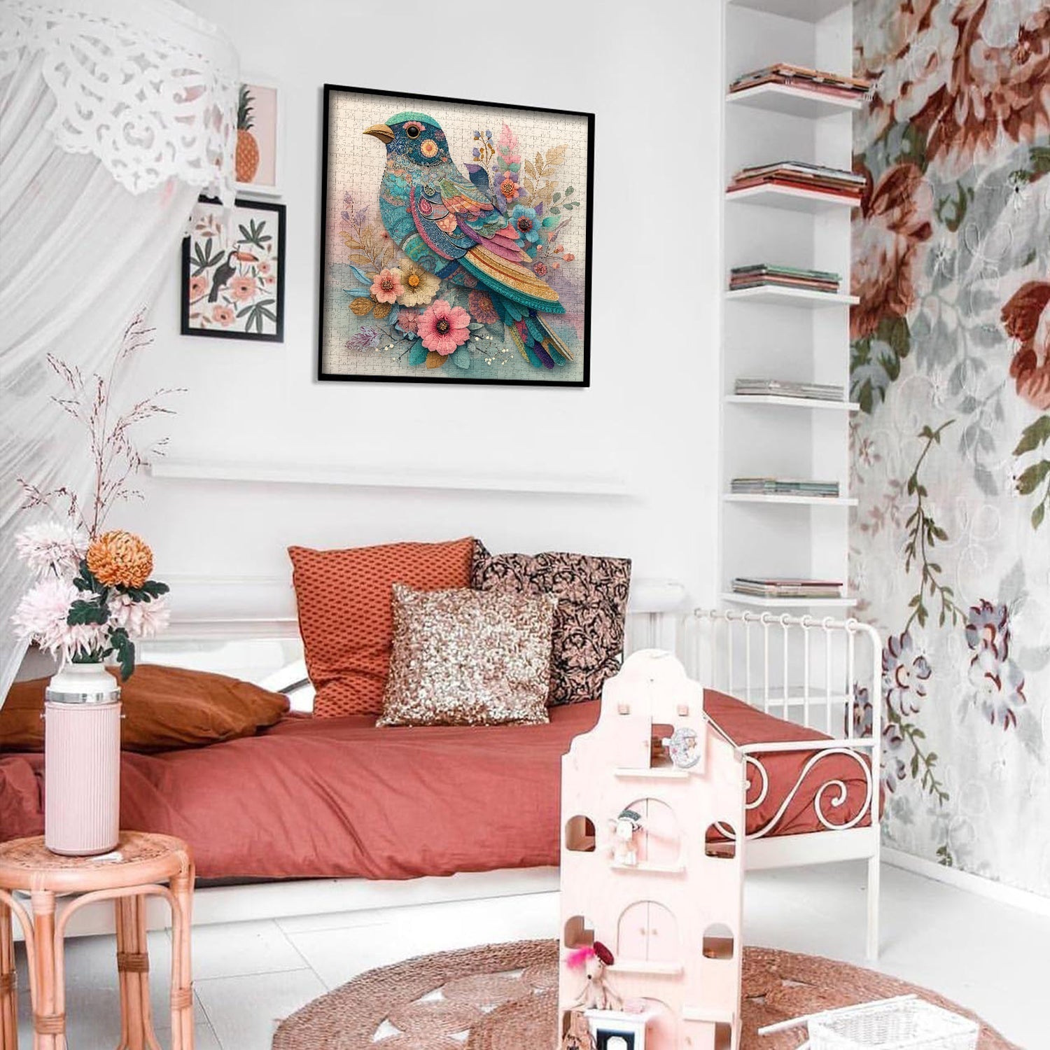 Vintage - Inspired Patterns: The patterns on the bird’s body include intricate designs reminiscent of traditional textiles and ornate art, contributing to a nostalgic aesthetic.