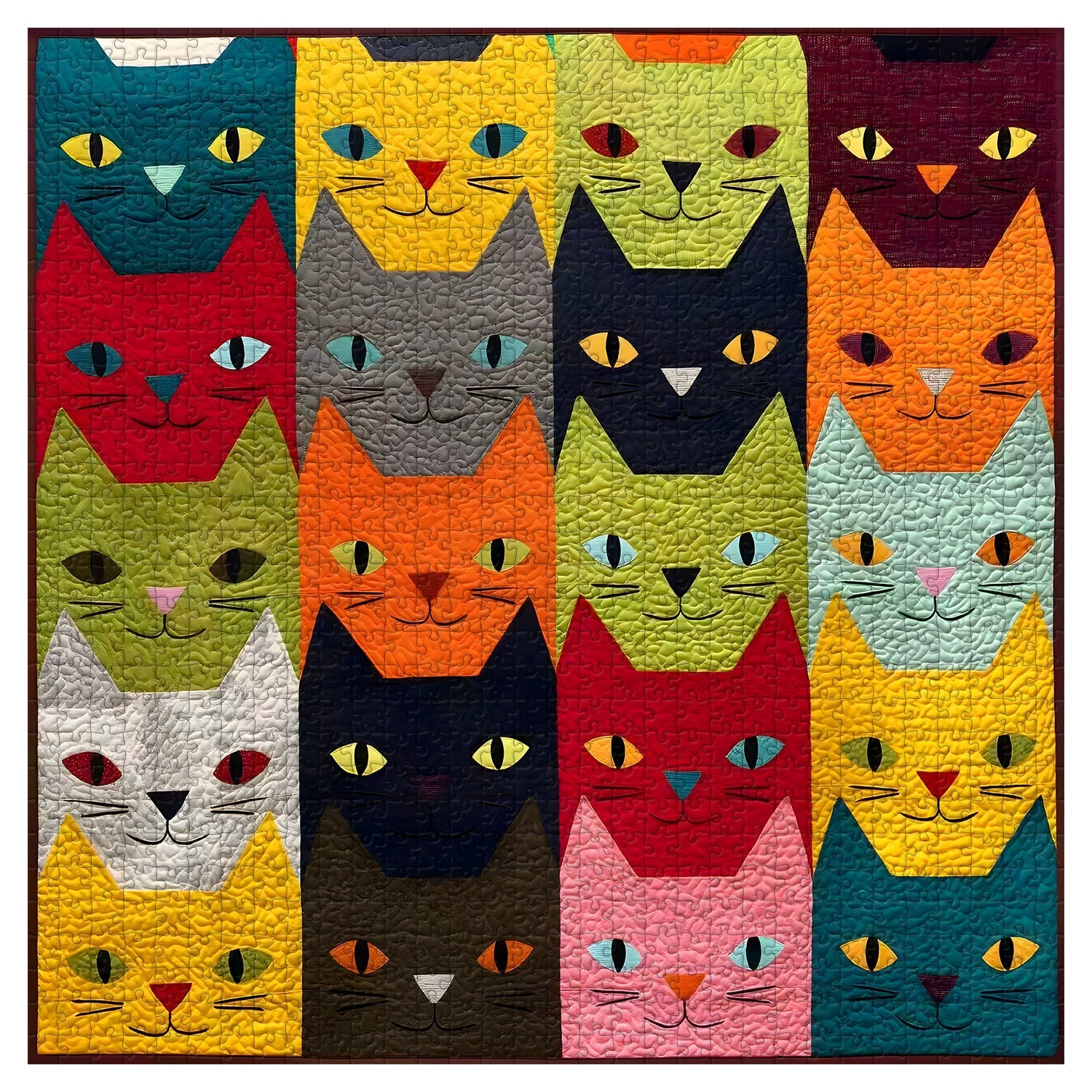Artistic Technique: The piece employs a combination of color blocking and possibly appliqué or similar techniques to form the distinct cat faces, showcasing skill in creating defined shapes.
