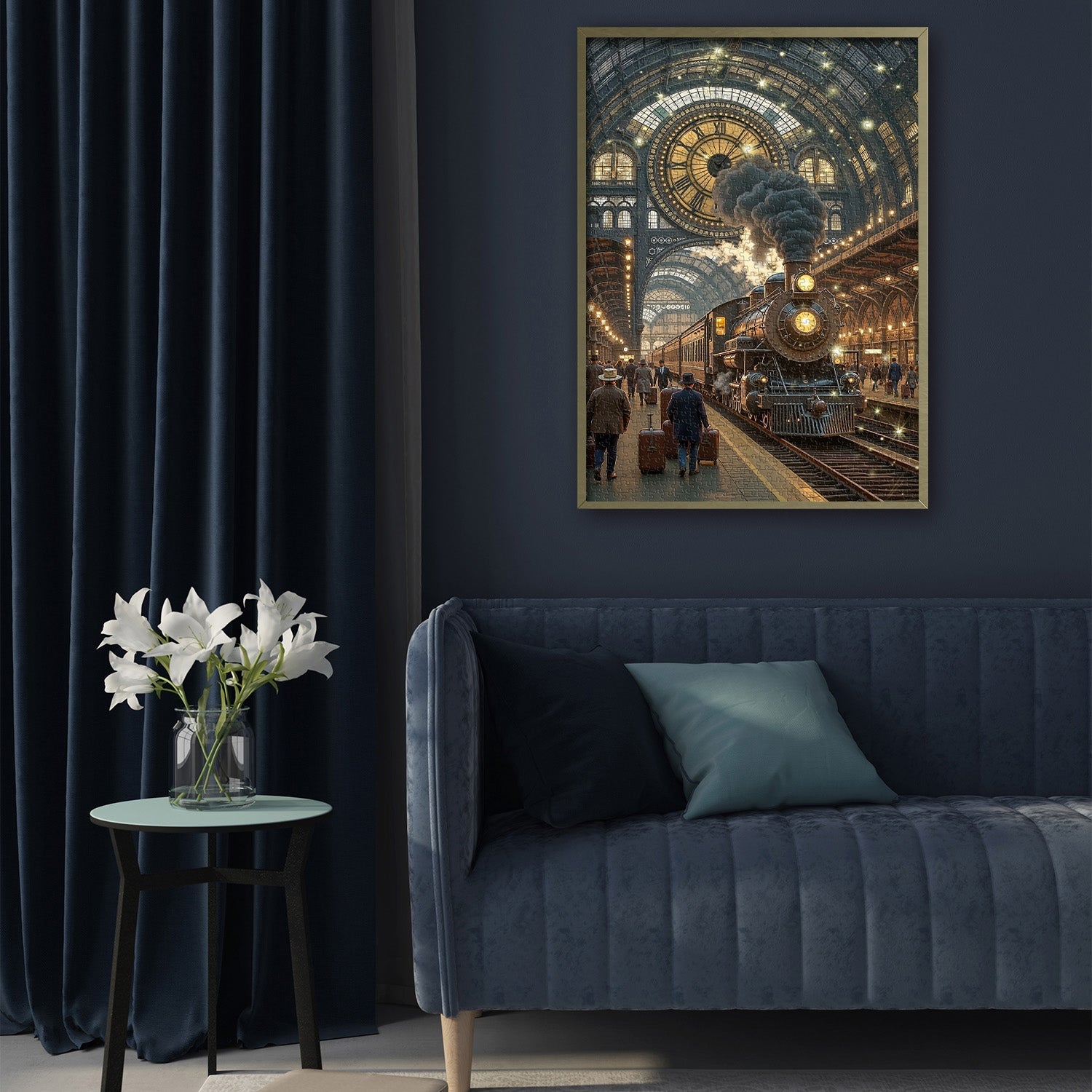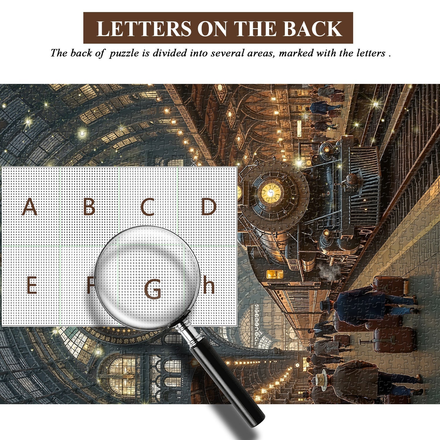 ⚙️🧍Key Elements: Features a detailed steam locomotive, a massive antique clock, arched glass ceilings, and period-dressed travelers, all rendered with intricate puzzle piece details.