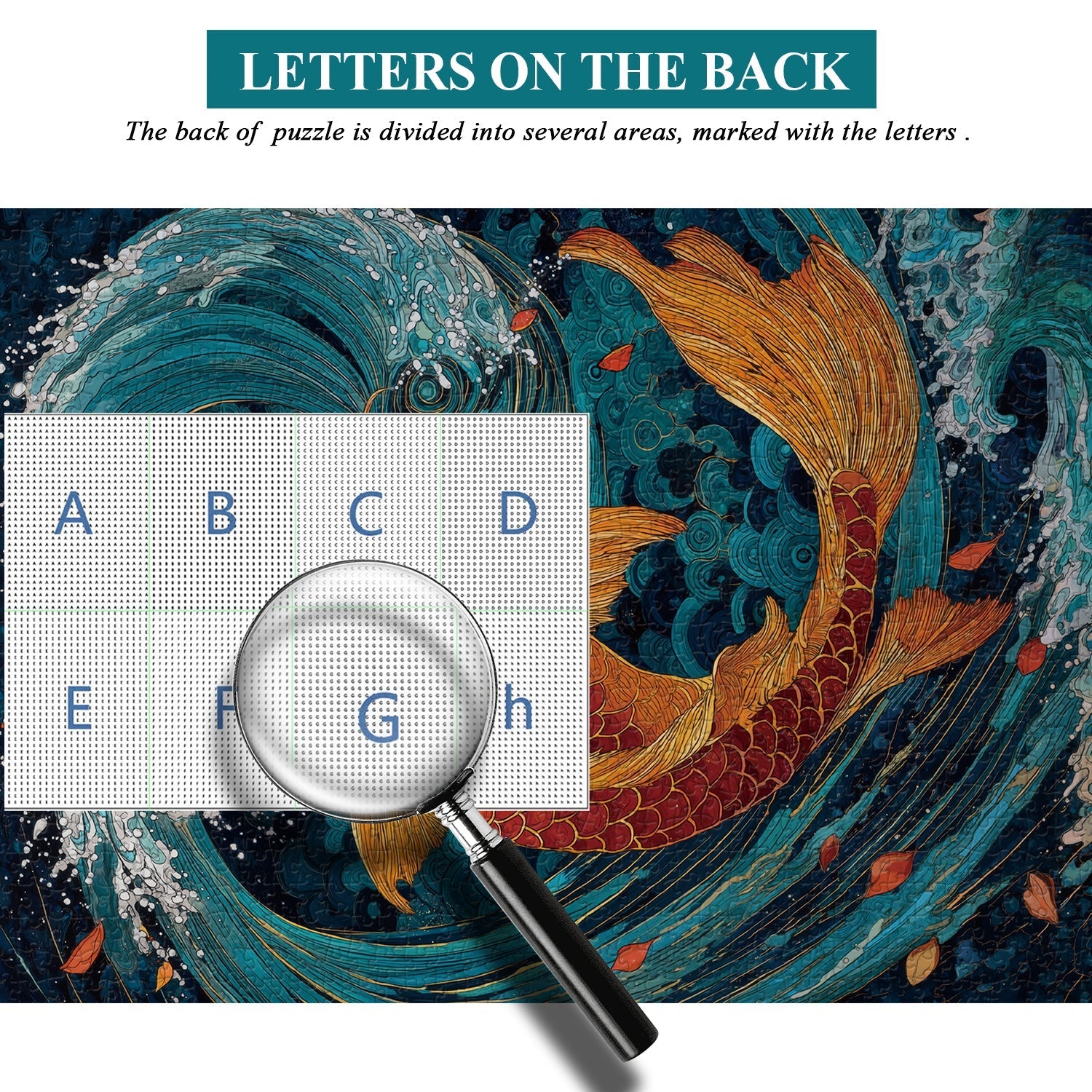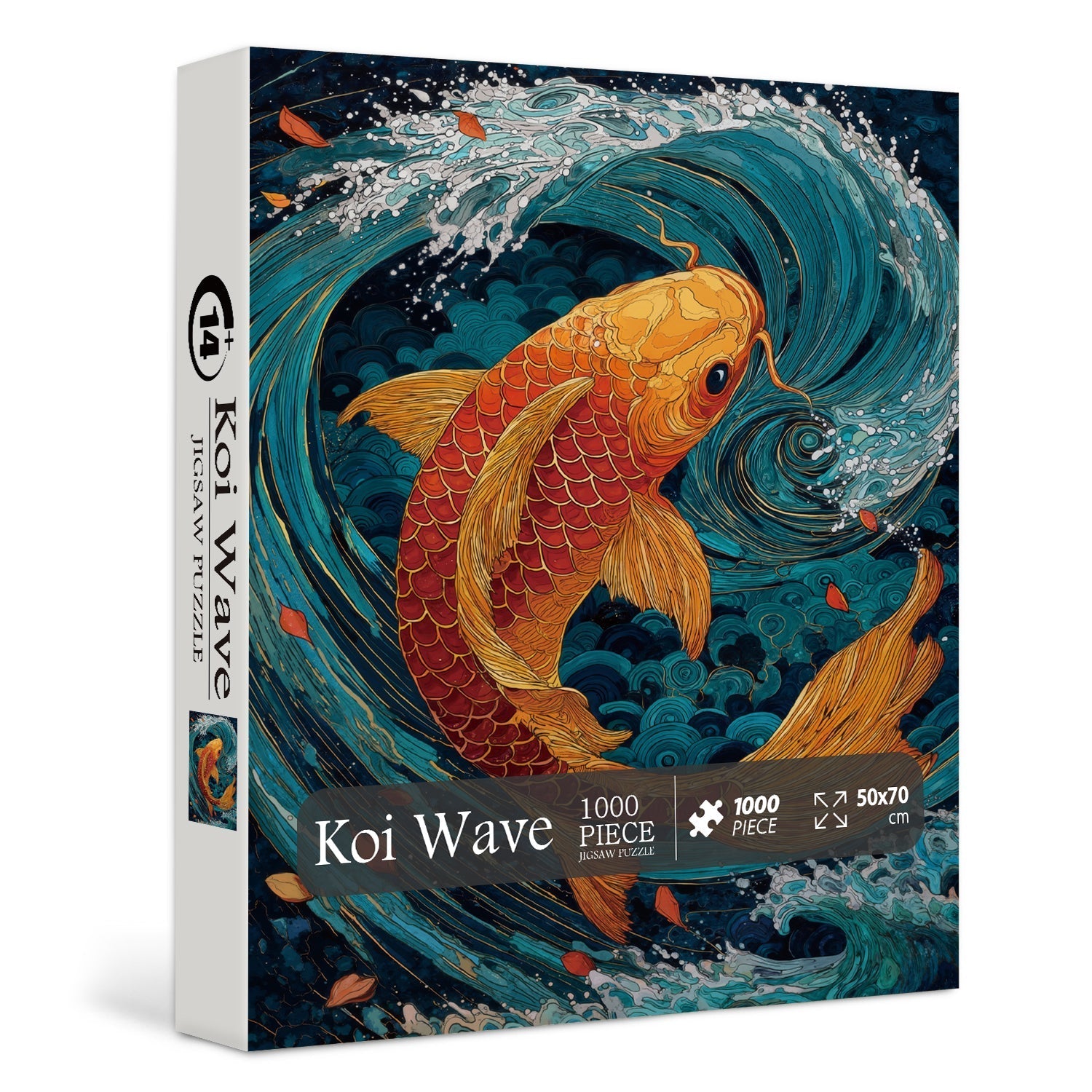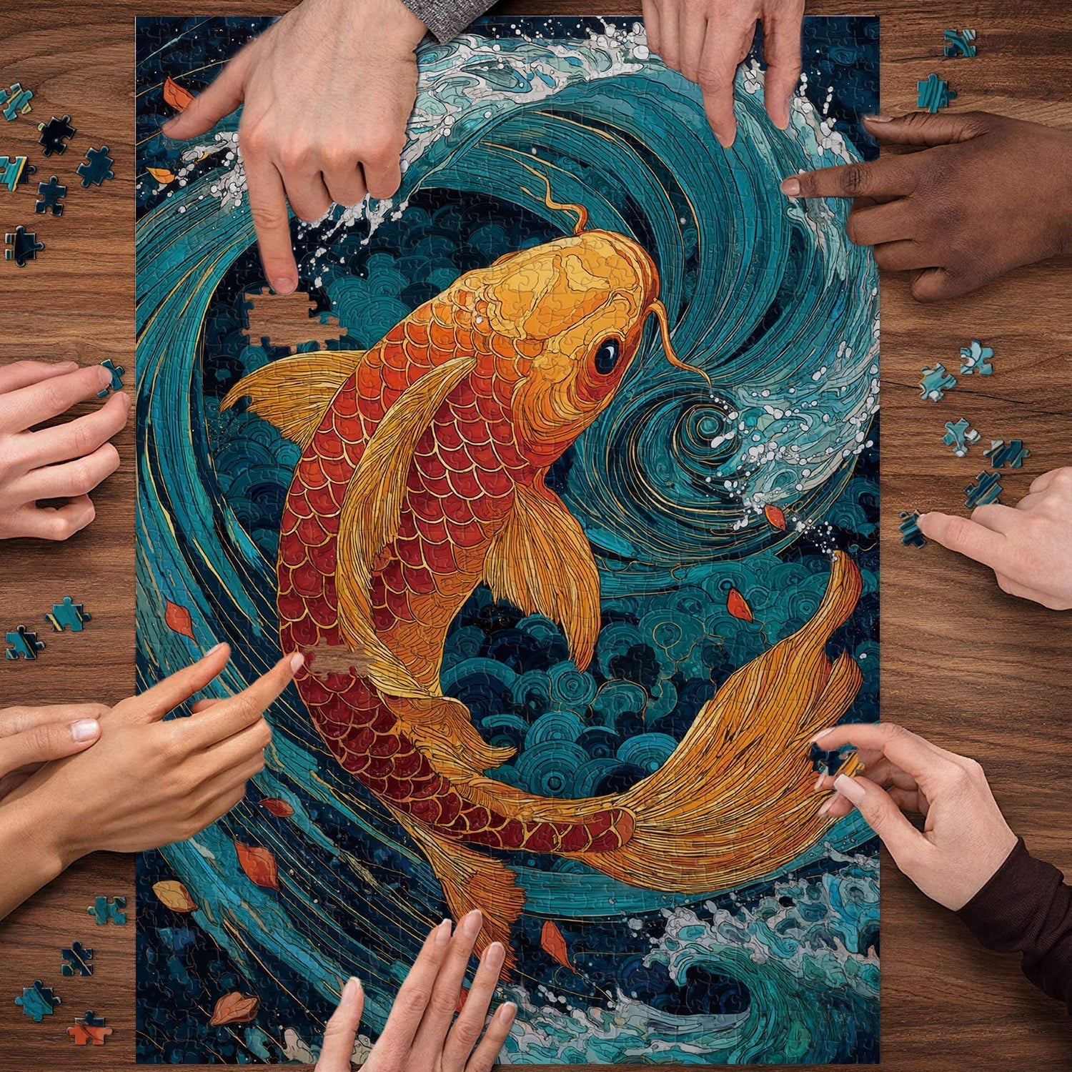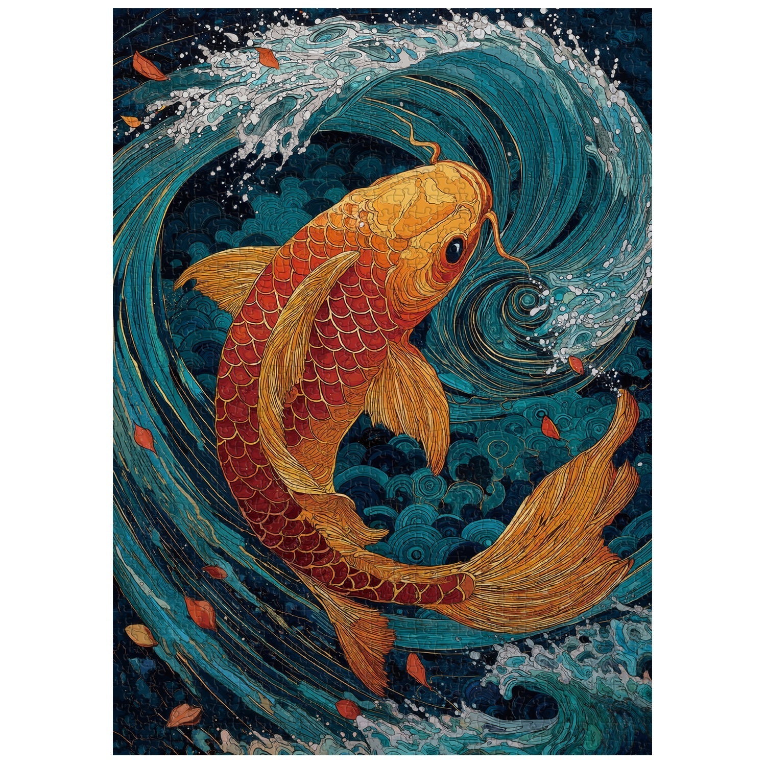 Symbolische Elemente: Schwebende rot-braune Blätter sorgen für einen subtilen saisonalen Touch, während das Koi-und-Wellen-Motiv an Themen erinnert Widerstandskraft und Glück (üblich in der ostasiatischen Symbolik).