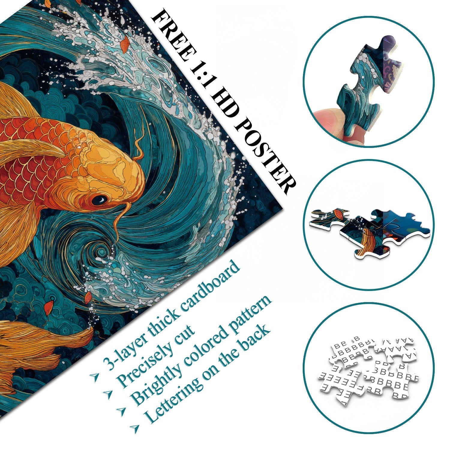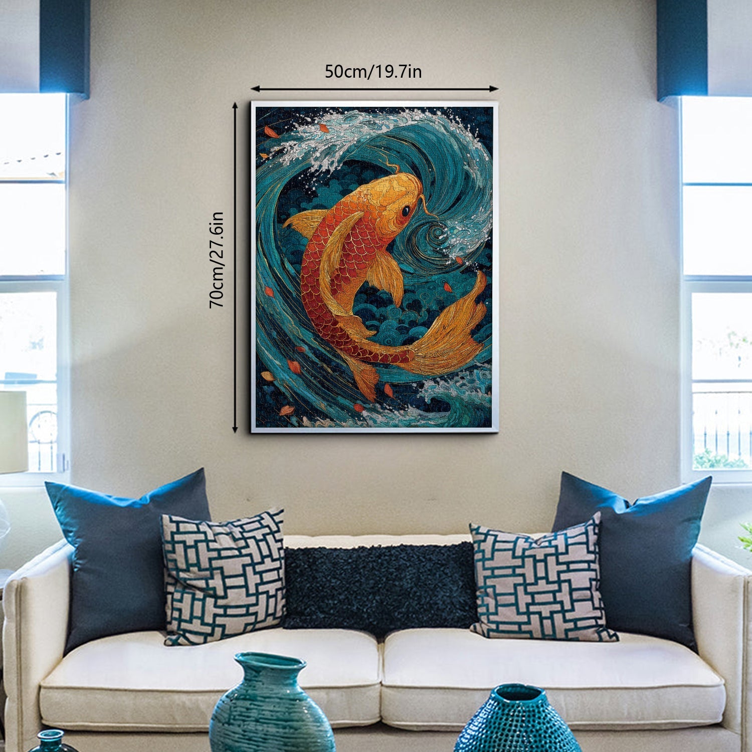 Farbpalette: Das Stück verwendet einen auffälligen Kontrast von Warmes Gold/Rot (Koi) und kühles Blaugrün/Marineblau (Wellen), mit dezenten schwarzen und weißen Details (Schaumstoff, Hintergrund), um die Lebendigkeit des Motivs hervorzuheben.