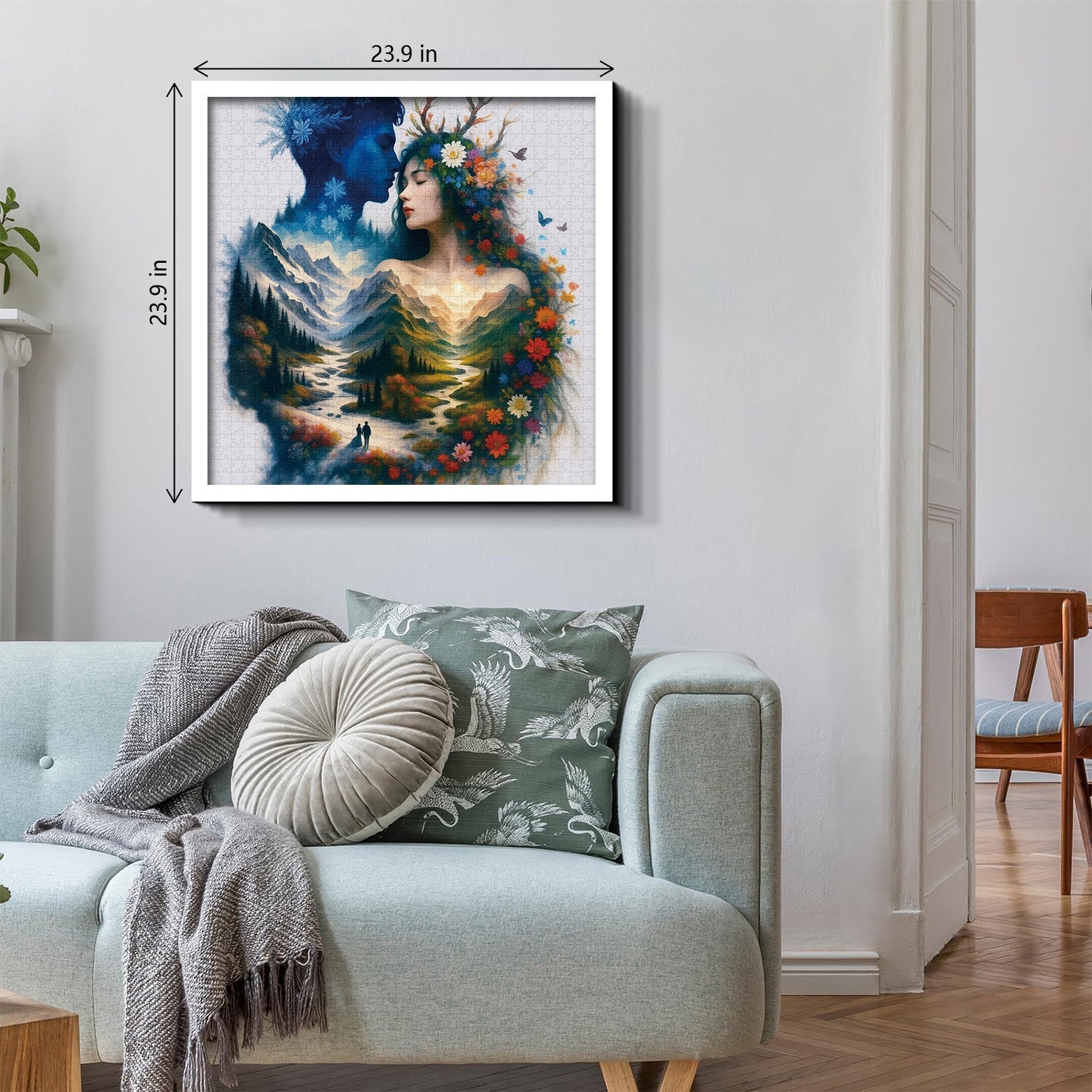 Intricate Landscape Integration: A detailed mountainous landscape with rivers, forests, and a couple walking is seamlessly integrated into the figures, creating a multi - layered and immersive visual effect.