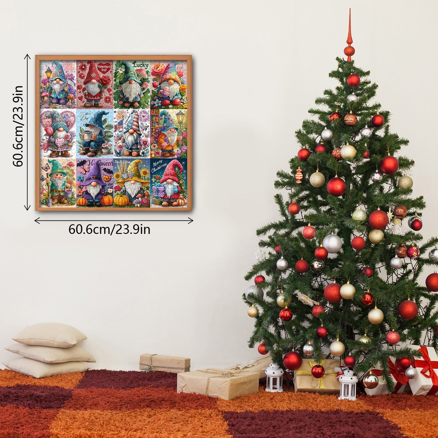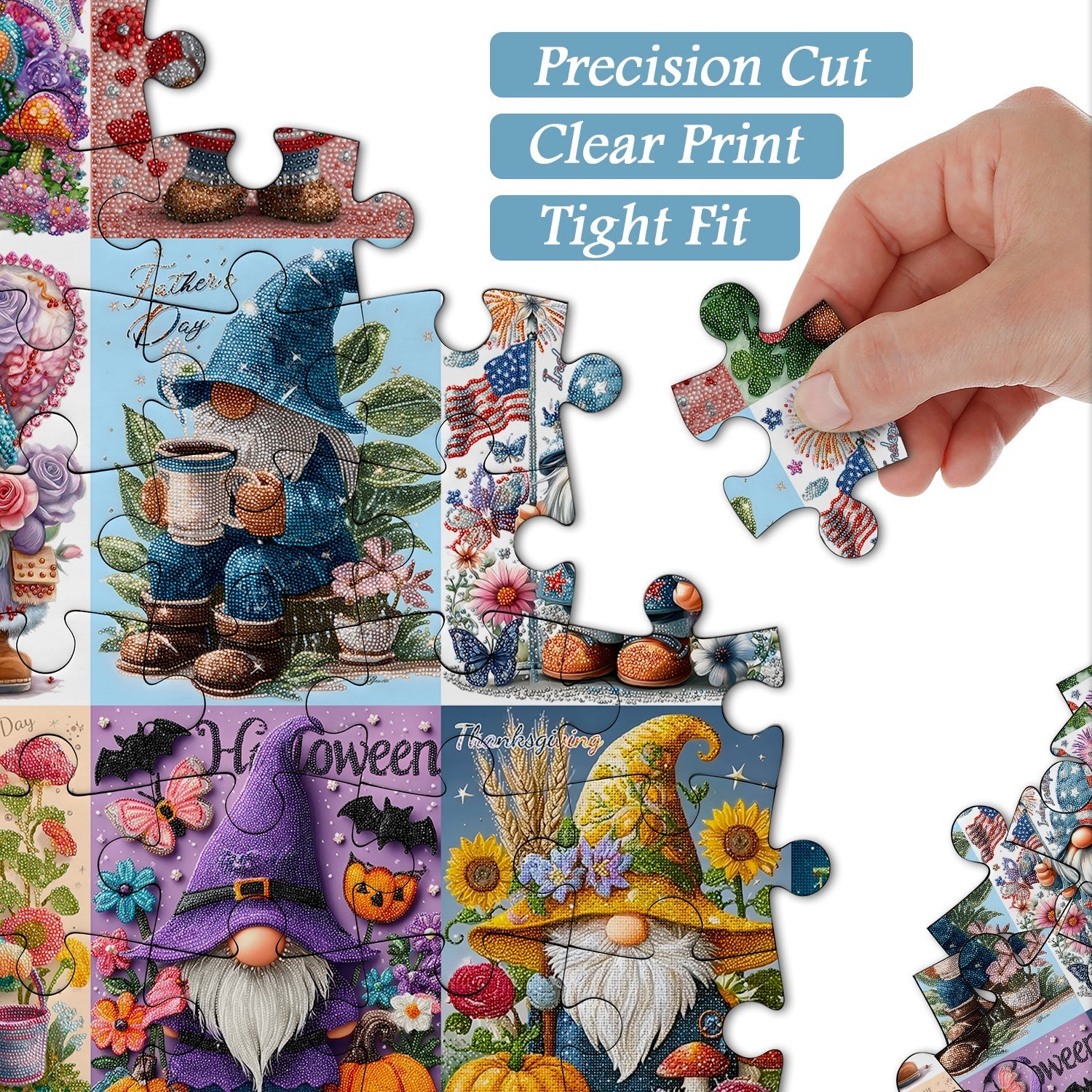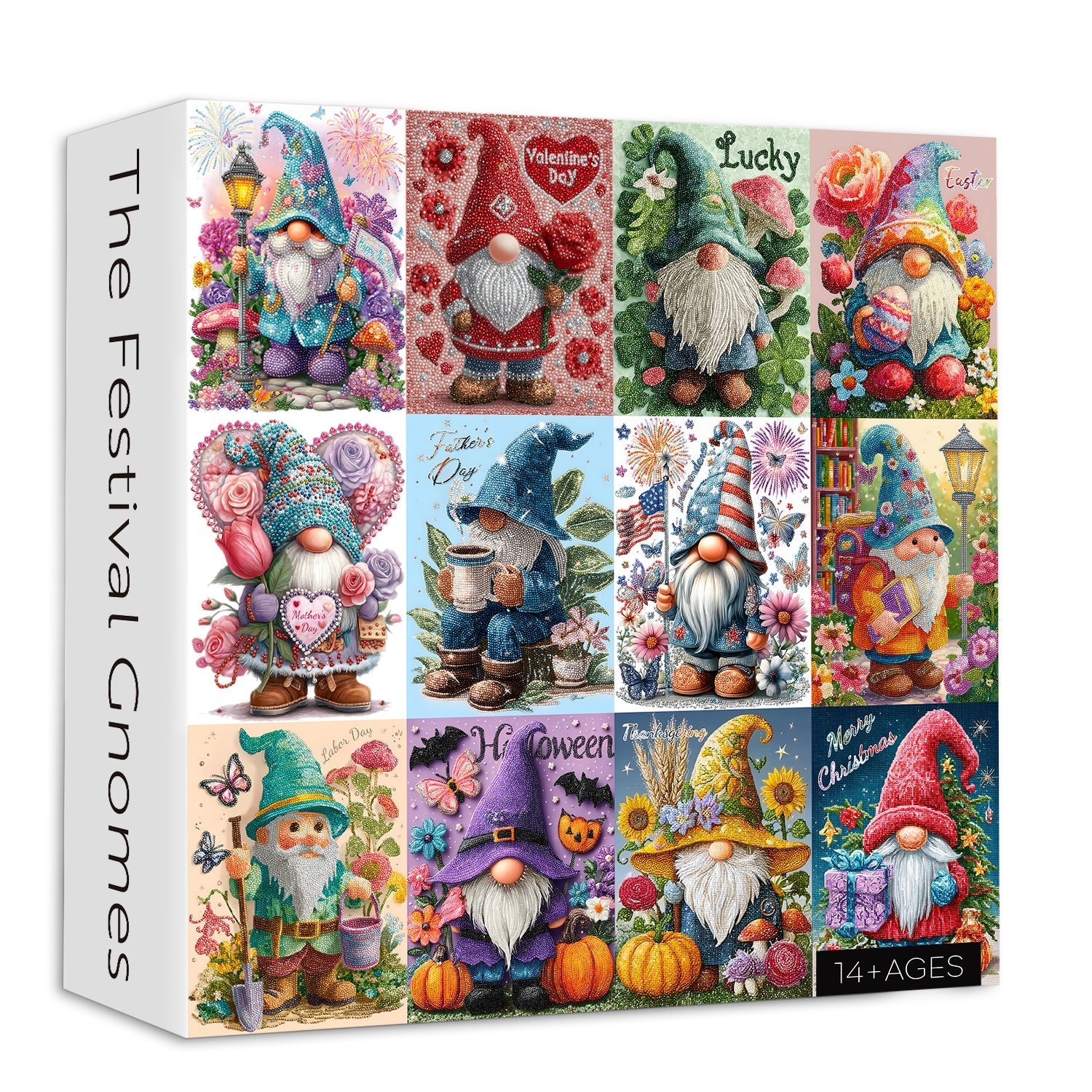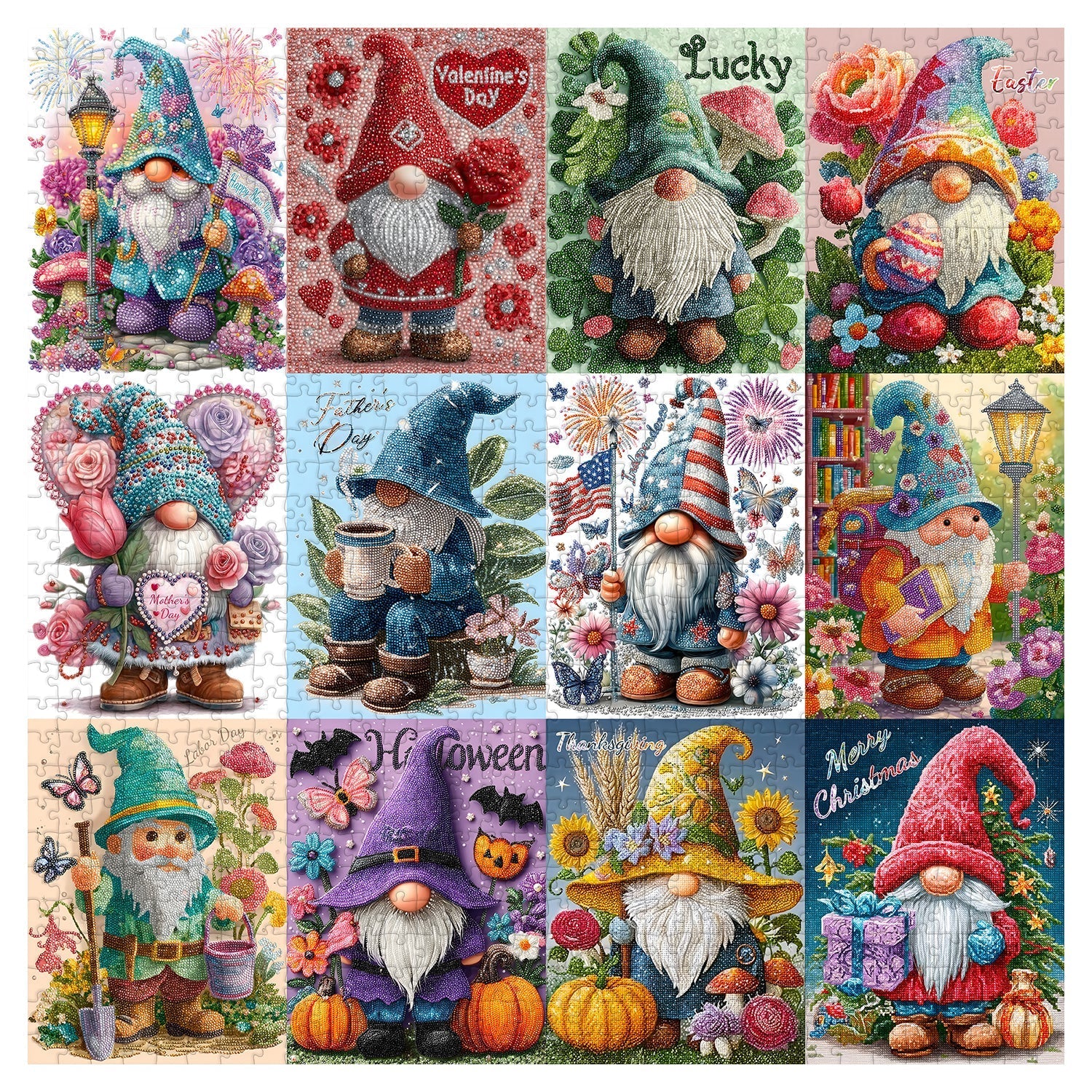 Variedad temática: Muestra gnomos temáticos en torno a diferentes festivales y ocasiones, como el Día de San Valentín, el Día del Padre, Halloween, Acción de Gracias y Navidad, cada uno con sus elementos correspondientes como corazones, rosas, calabazas y árboles de Navidad.