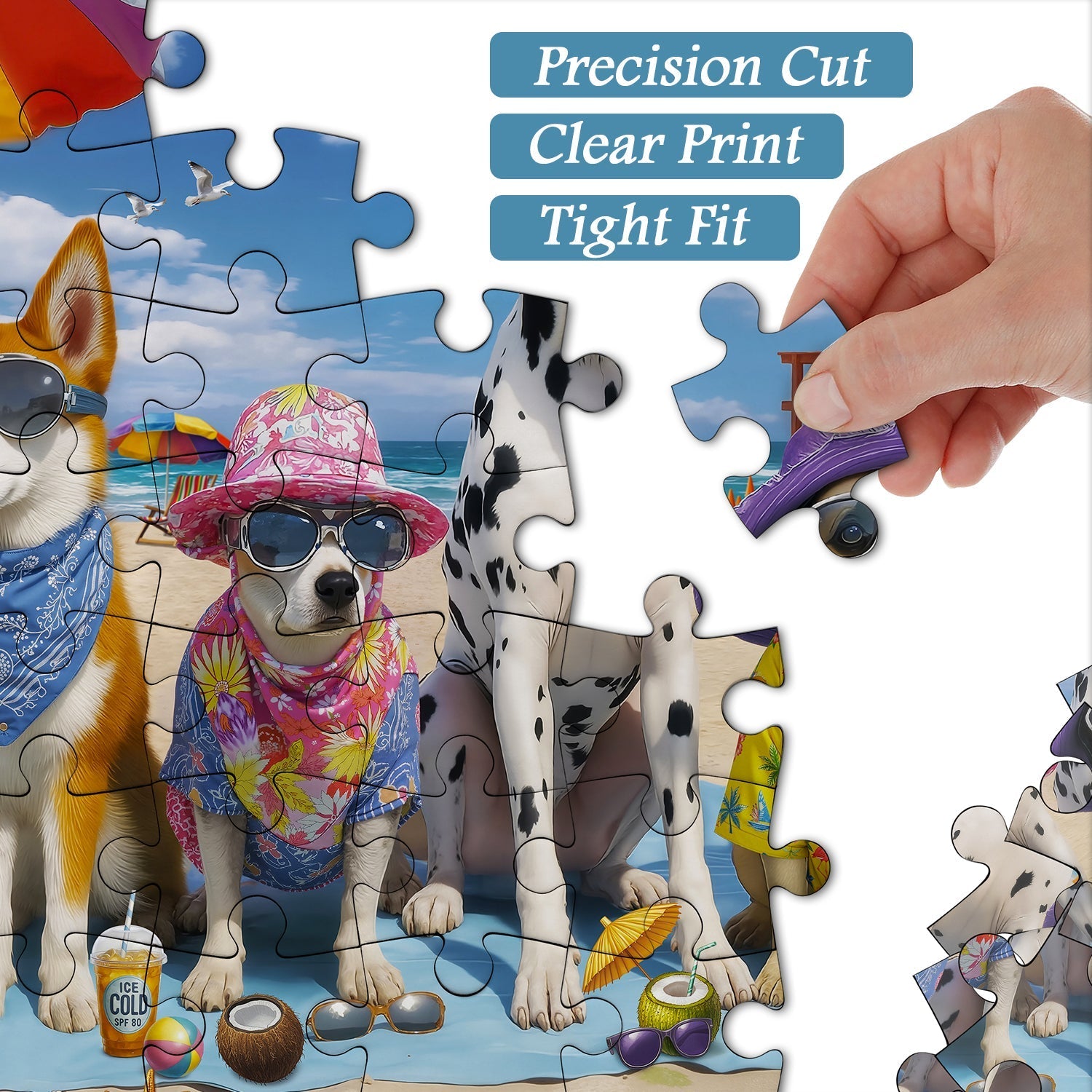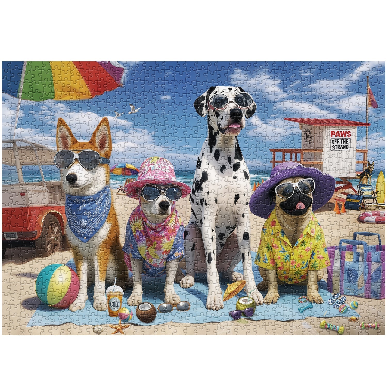 Cadre de plage avec personnages canins: Quatre chiens (un Shiba Inu, un petit métis, un Dalmatien et un Carlin) sont les stars, posés sur une serviette de plage au milieu d'une scène côtière ensoleillée (océan, mouettes et équipement de plage en arrière-plan).