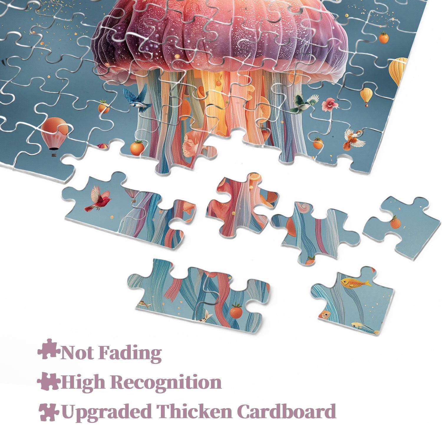 Éléments flottants fantaisistes: Le ciel est rempli de petits détails : montgolfières, poissons volants, oiseaux et petites figures ailées (interagissant avec les tentacules de la méduse), renforçant l’atmosphère onirique et magique.
