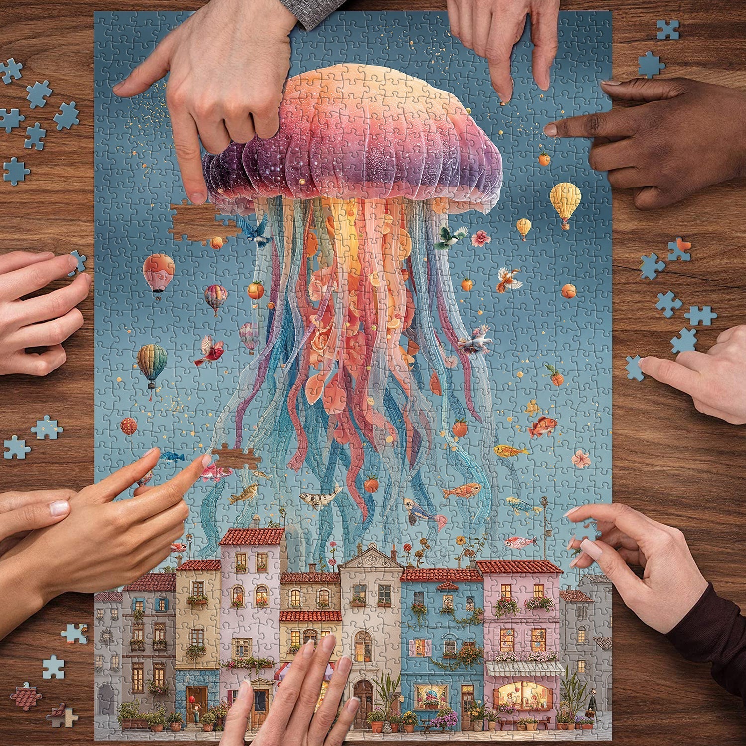 Méduse fantastique géante: Le point focal est une méduse éthérée surdimensionnée (avec une cloche dégradée rose/violet et des tentacules fluides et multicolores) flottant au-dessus de la ville, mélangeant des éléments aquatiques et aériens.