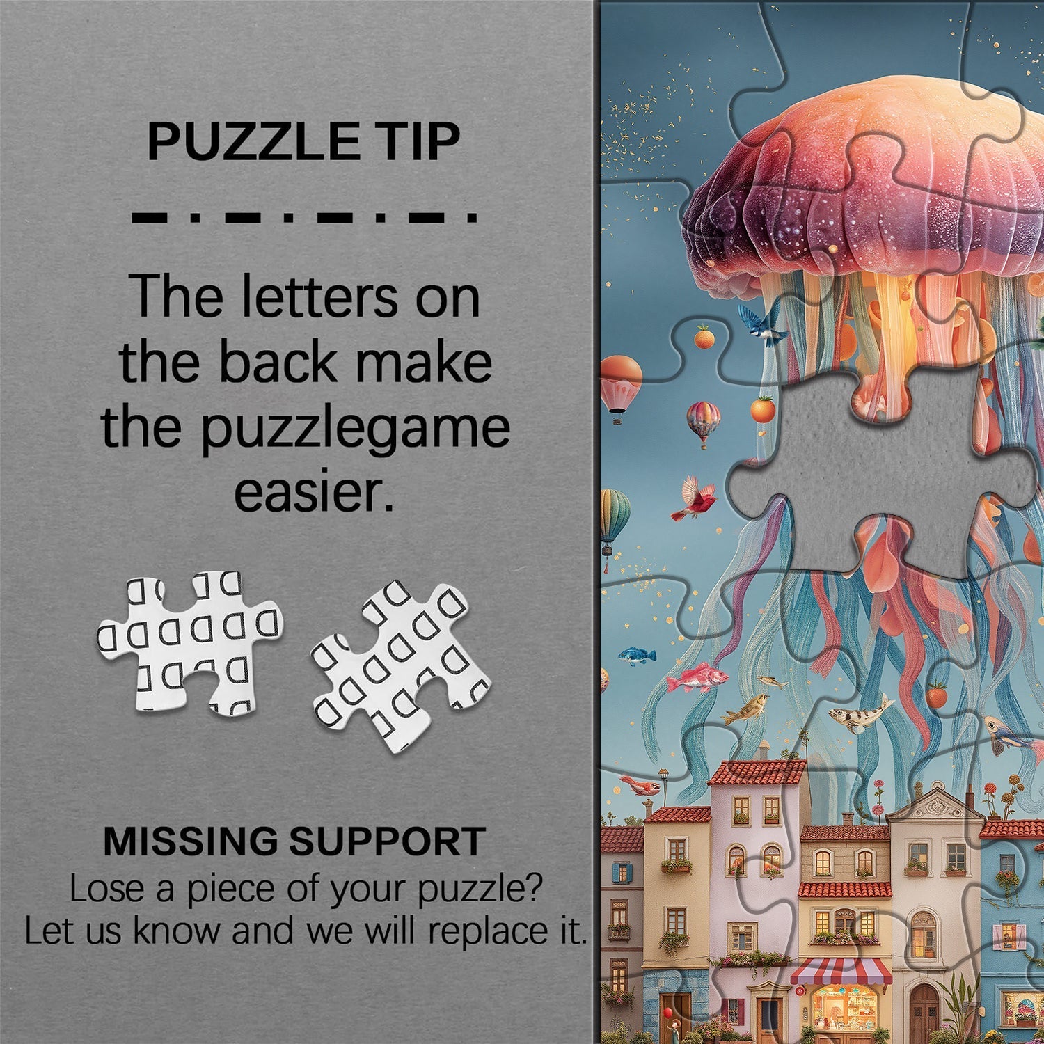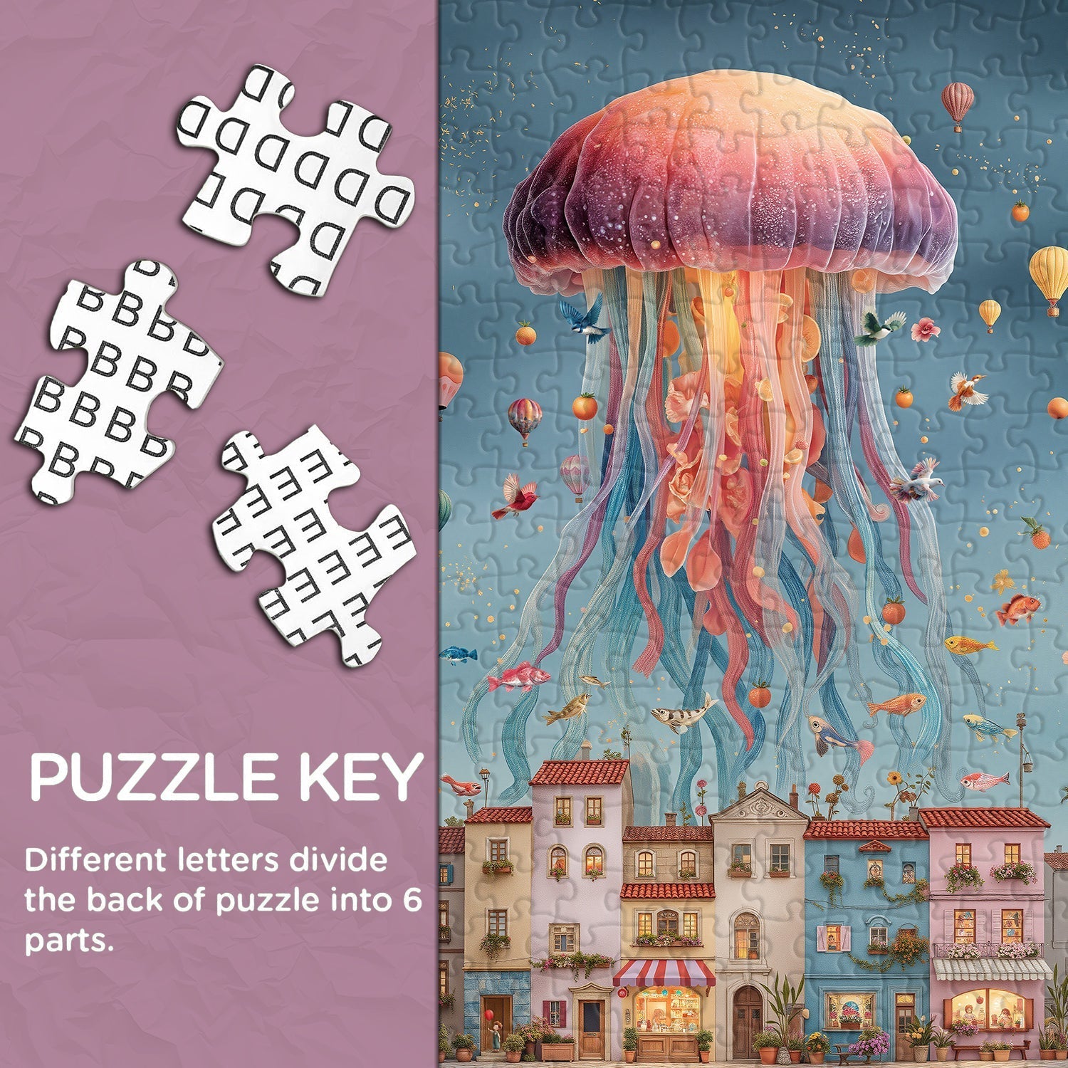 Toile de fond de la ville côtière: Sous la méduse se trouve un charmante ville colorée de style méditerranéen (bâtiments aux couleurs pastel, toits de tuiles rouges, devantures de magasins) qui ancre la scène fantaisiste dans un cadre familier et cosy.