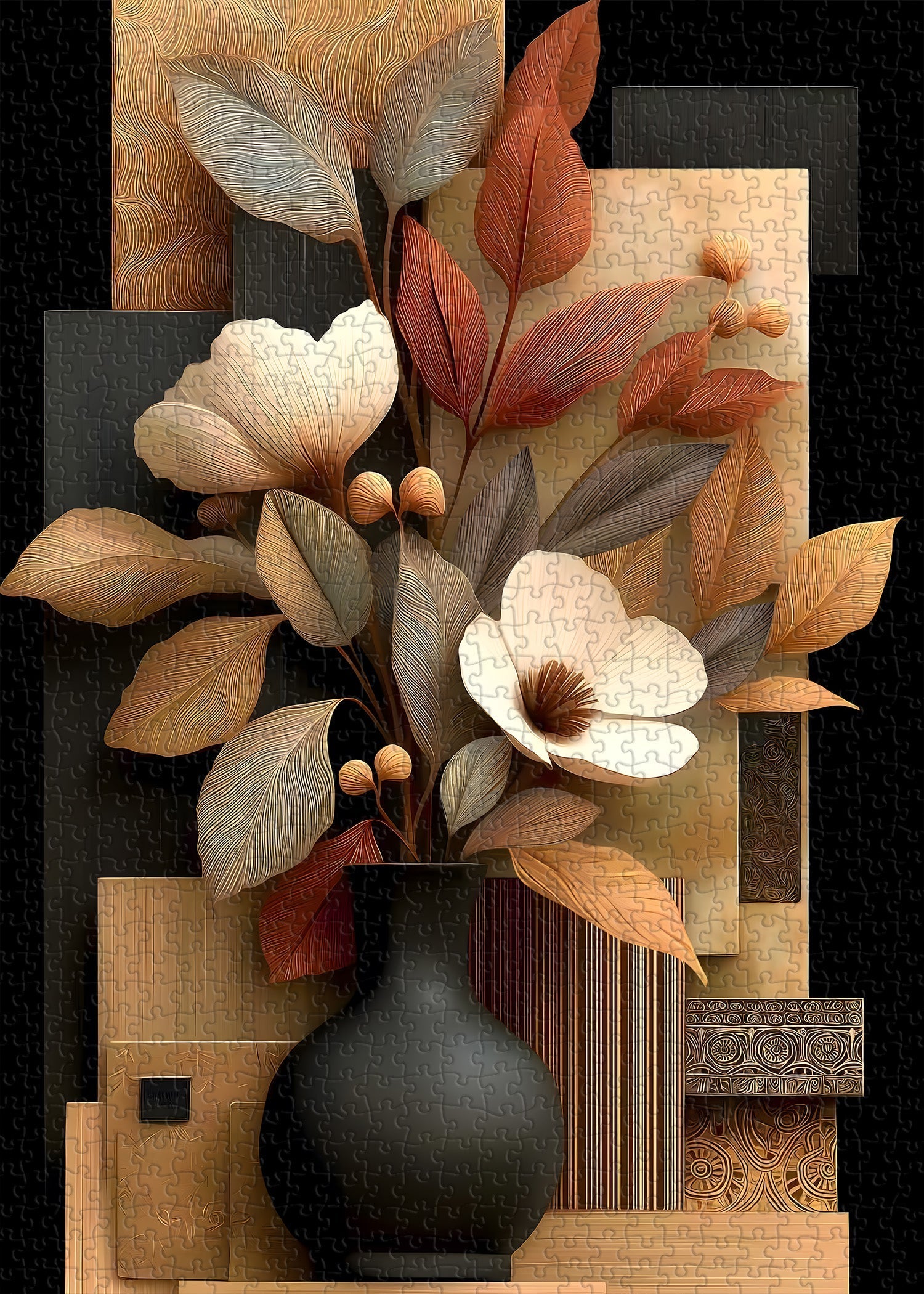 Textures et palette de couleurs: Les feuilles et les fleurs ont des textures détaillées et linéaires, le vase est lisse et mat et la palette de couleurs globale mélange des tons chauds et neutres, résultant en une composition artistique sophistiquée.