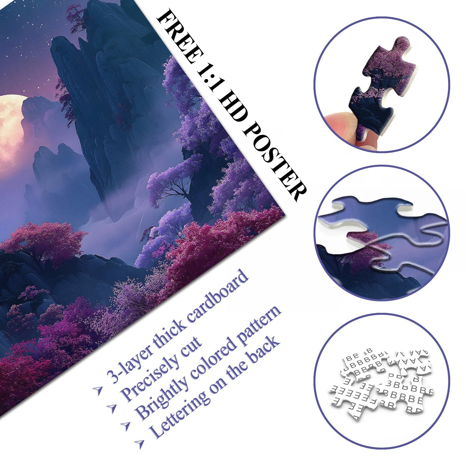 Color Palette: The image features a dreamy color scheme dominated by shades of purple, pink, and deep blue, creating a tranquil and magical atmosphere.