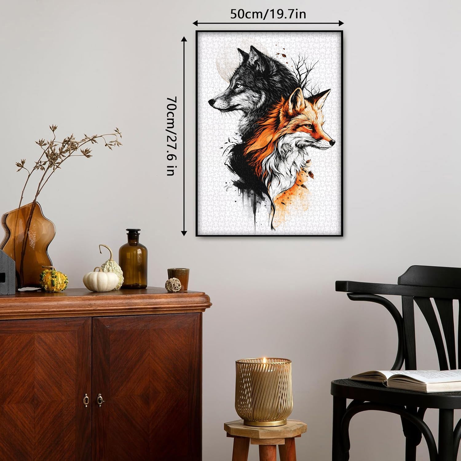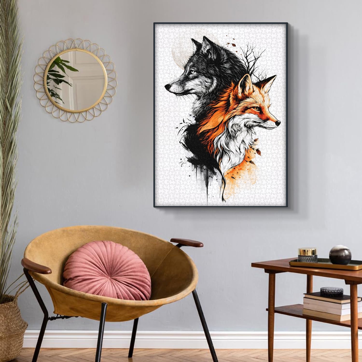 Dramatic Monochrome + Warm Tone Palette:The stark black-and-white wolf pairs with the rich orange fox,elevated by subtle watercolor textures—brought to life via high-quality, fade-resistant printing.